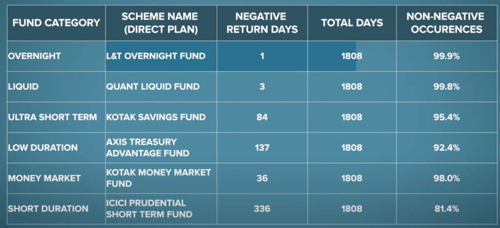 there are two criteria to look for when identifying assets that will be used for short-term gains and uses. They are safety of capital, liquidity or accessibility, and potential Returns. Different asset classes carry different levels of risk, while there is always going to risk it is also important to understand the extent and practicality of the risk. If your short-term goals include maximum safety, you can consider the chart below for non-negative days. In that case, the best strategy for nonnegative is an overnight fund which basically has almost zero waste of money. Next, we need to consider liquidity, the fastest mode of accessing money, in this case, would be a bank savings account as it allows for online bank transfers and withdrawals. The next most accessible mode for liquidity will be a fixed deposit which is optimal to be used for short-term needs such as buying a phone or a laptop.