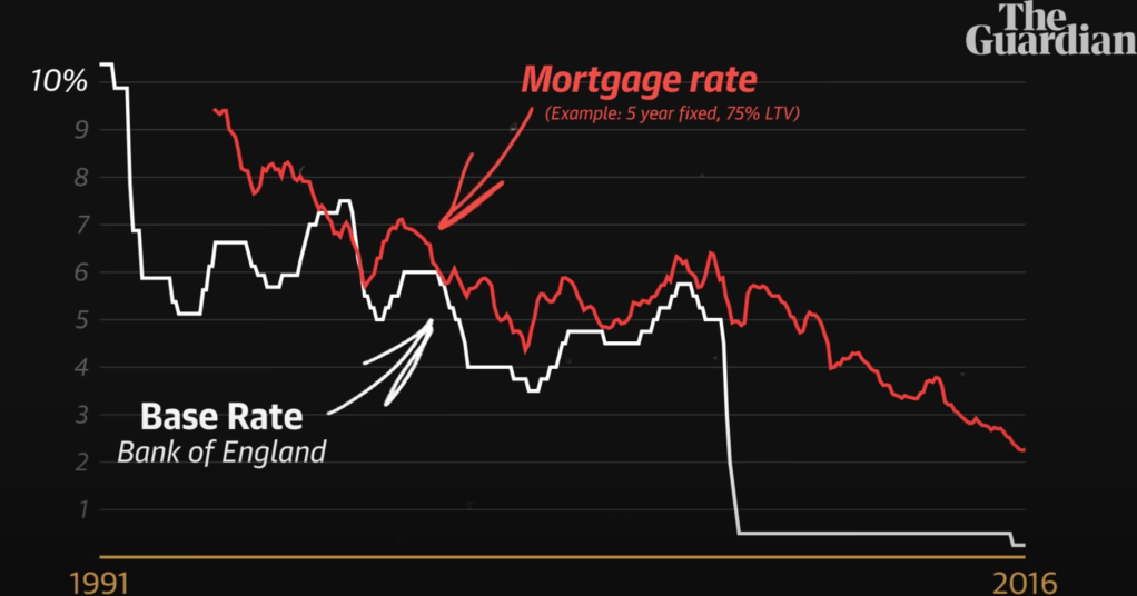 This does explain to some extent the surge in buy-to-let in the previous section. According to the bank of England, the decline in interest rates “can account for all of the rising house prices.”